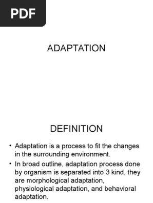 Physiological adaptations are similar to structural adaptations in the sense that they involve a physical change to the species. The act or process of adapting. The word can also refer to a trait that is considered an adaptation.