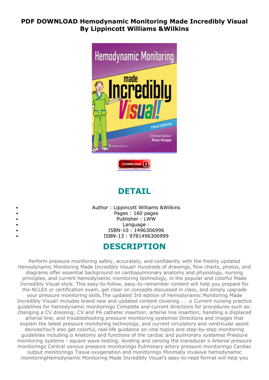 37 full pdfs related to this paper. Series hemodynamic monitoring made incredibly visual second edition combines images and clearly written concise text to make the compl seeing is believing. Hundreds of drawings flow charts photos and diagrams offer essential background on cardiopulmonary anatomy and physiology nursing principles and current hemodynamic monitoring technology in the popular and colorful made incredibly visual style.