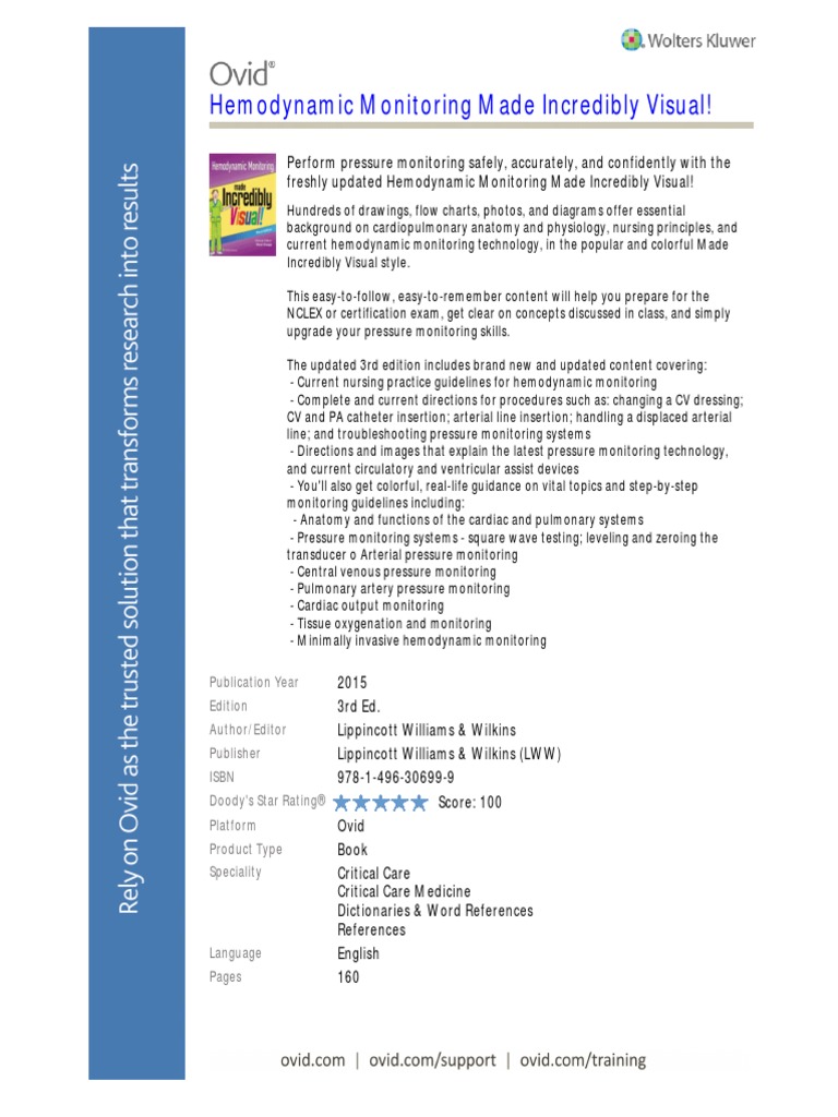 Hemodynamic monitoring made incredibly visual. Hemodynamic monitoring made incredibly visual second edition provides an innovative visual approach to understanding the principles and practice of hemodynamic monitoring. Full of colorful images that illustrate monitoring concepts and processes this concise enjoyable guide sorts through the complexities of hemodynamics and clarifies them in easy to follow ways. Build a solid knowledge base in hemodynamic nursing skills with the newly updated hemodynamic monitoring made incredibly visual 4th edition.